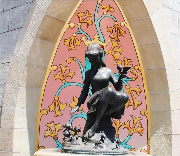 - Uno de los personajes más emblemáticos de las producciones de Walt Disney es La Cenicienta. Durante toda su vida trabaja de sirvienta en la casa de su madrastra para finalmente convertirse en la princesa de todo el reino. Y el castillo de Magic Kingdom situado en Orlando es de verdad mágico si consideras este detalle. Detrás del castillo puedes encontrar la estatua de Cenicienta y una fuente. Cuando te inclinas para beber de ella, podrás ver en el reflejo del agua una corona sobre la cabeza de la estatua. Es un efecto visual que se ha conseguido gracias a un diseño característico y cuidadoso y una combinación perfecta de la estatua con la pintura de fondo.