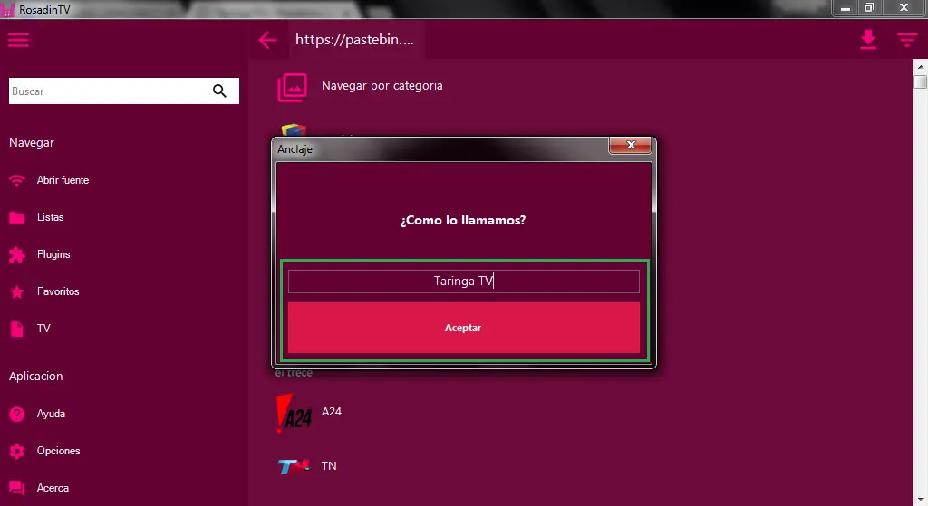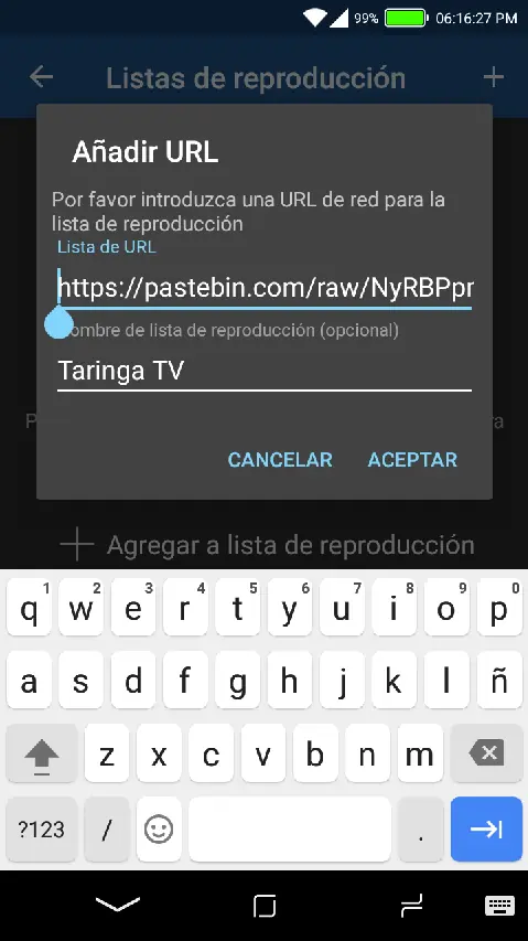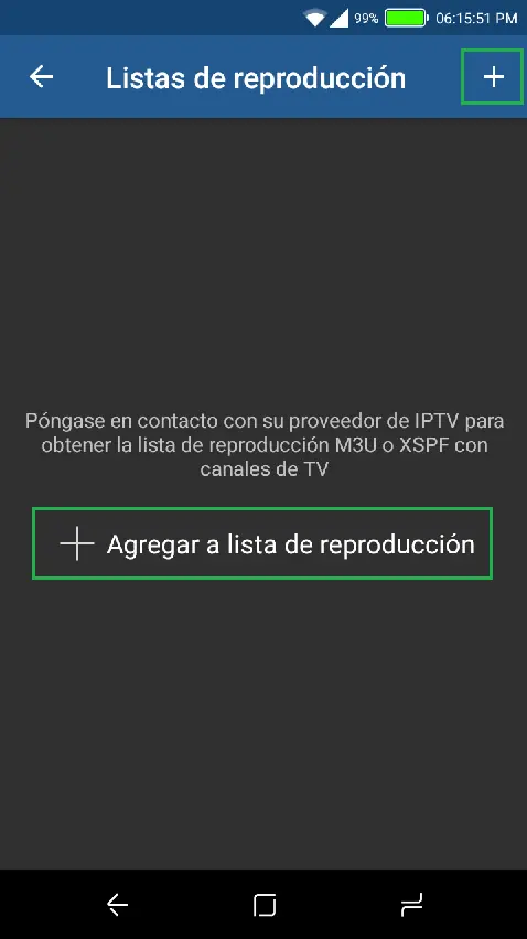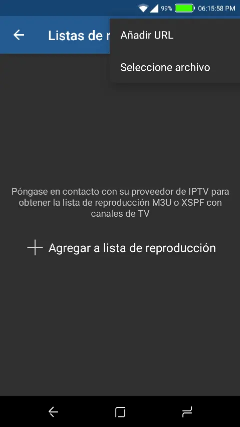 Esta es la aplicación para Android llamada simplemente IPTV. Para agregar una lista, hacen click en el símbolo + y agregan primero el enlace que les dejaré, y luego un nombre cualquiera que les guste.