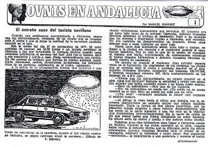 Un día después de la insólita visita que tuvo la familia Sánchez Cotán en Olivares sucedió otros de esos extraños casos que marcarían nuestra Historia Ufológica. Antonio González Morales, taxista sevillano, observó al filo de la medianoche junto a sus pasajeros una serie de luces que creyeron que podría ser un avión dada la proximidad del aeropuerto de Sevilla… Las luces se comenzaron amover y se realizando una maniobra rápida y de fundido se colocó en paralelo al taxi de Antonio… aquello parecía “dos platos encarados por su base que iban iluminados por una franja exterior anaranjada, encima había un piloto verde y debajo uno rojo, aquello tendría unos cinco metros de largo por uno y medio de alto”. El objeto no emitía sonidos y el nerviosismo invadió a todos los ocupantes del vehículo… Antonio volvió tras dejar a los ocupantes en su destino pero ya no había nada ni nadie más vio nada.