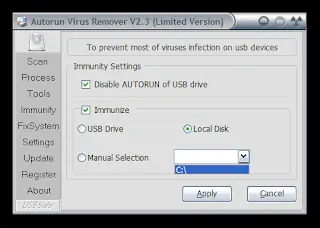 Era algo asi como c:/2h2h.com que tampoco se podía eliminar con nada, y probé de todo, probé con varios desconococidos antivirus freewares pero nada, hasta que probé con el panda 2009 y por un momento creí que había conseguido eliminarlo pero NO, el problema continuaba. El nod32 no lo detectaba, el *** tampoco, ni hablar del spyware doctor. Probé muchos cachibaches que recomendaban en uno que otro foro y nada, hasta que me topé con uno llamado AutorunRemover que para mi sorpresa ya lo tenía en la pc desde la ultima vez que tuve que formatear por un jodido virus de sistema que no me dejaba opción. Solo que no sabía que este antivirus era muy util para eliminar definitivamente el autorun.inf , lo que tenía que hacer era abrir el AutorunRemover , seleccionar el disco C con el, y scanearlo . una vez terminado el scaneo le daba en inmunnity y marcaba los casilleros tal cual muestra la imagen :