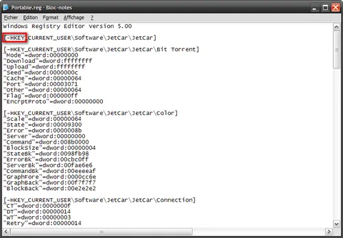 En la tercera línea: cambia "HKEY_CURRENT_USER\Software\JetCar" con la clave del registro utilizada por la aplicación.
