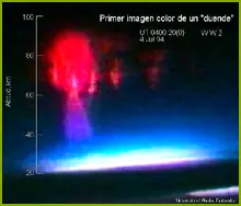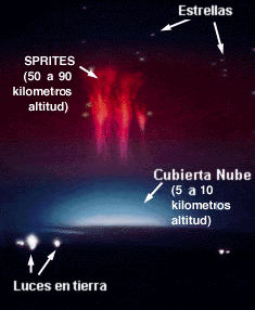 Se han descubierto hace poco las denominadas descargas de gran altitud, relámpagos coloridos que se producen por encima de las tormentas. Se les han dado muy diferentes nombres como: "duendes rojos" (red sprites); "chorros azules" (blue jets); y "elfos verdes" (green elves), que se refieren a sus diferentes formas. Se descargan desde la parte superior de las tormentas al mismo tiempo que se producen descargas de rayos dentro de las nubes.
