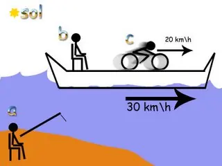 él a 20 km/h. Para el ciclista el lector permanece quieto con respecto al barco. Por otro lado tenemos a un pescador sentado en