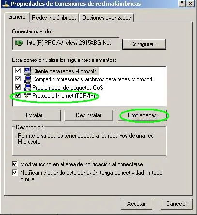 Para configurar nuestra IP nos dirigimos a la pestaña general de la ventana Propiedades de Conexiones de red inalámbricas y pinchamos sobre Protocolo de Internet (TCP/IP) y a continuación sobre el botón Propiedades.