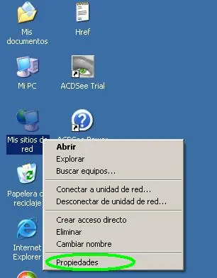 Para empezar, debemos localizar el icono Mis sitios de red en el escritorio de nuestro ordenador. Una vez localizado(normalmente suele encontrarse debajo o muy próximo al icono Mi PC), hacemos click con el botón derecho del ratón y nos apareara el menú contextual en el que elegiremos la opción Propiedades como se muestra en la figura.