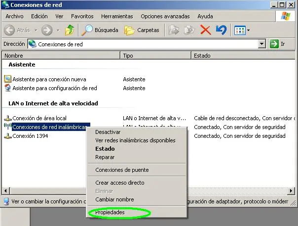 En la ventana que aparece a continuación volvemos a hacer click con el botón derecho del ratón sobre el icono Conexiones de red inalámbricas y también seleccionamos la opción Propiedades como muestra la figura.