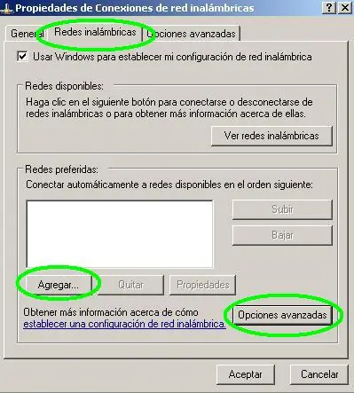 Aparecerá una nueva ventana, en la que tenemos que hacer clic con el botón izquierdo del ratón sobre la pestaña Redes inalámbricas, y una vez dentro, pulsar en el botón Opciones Avanzadas, como muestra la figura.