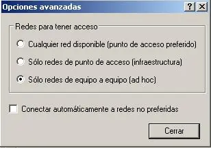 De nuevo veremos una nueva ventana, en la que hay que comprobar que está seleccionada la opción Cualquier red disponible (punto de acceso preferido) o Sólo redes de equipo a equipo (ad hoc).