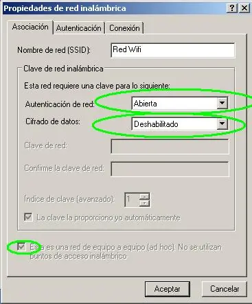A continuación verificamos que la última opción de la ventana Esta es una red de tipo (AD-HOC). No utilizan puntos de acceso inalámbrico está marcada.