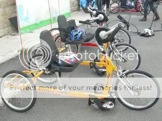 - Cuadriciclo. bicicletas de cuatro ruedas y doble pedal para discapacitados psíquicos que suelen ir con de un monitor o acompañante.