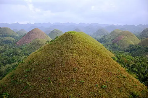 Las colinas de la isla Bohol, parece que son una construcción monumental hecha por el hombre. Sin embargo, son completamente naturales. Las colinas parecen bombones en forma de conos de chocolate, sobre todo en invierno, cuando los pastizales que las cubren quedan completamente secos, dándole su tono marrón.