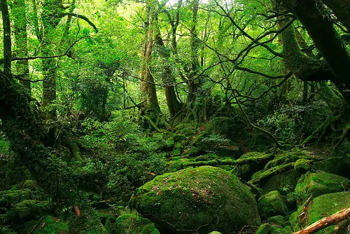 La isla Yakushima está cubierta por un denso bosque, que amparado por la humedad extrema, llega a recrear atmósferas densas de un verdor explosivo, decorado por las extrañas formas de ramas y árboles que crecen desproporcionadamente