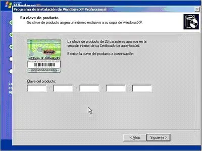 13-Seguidamente nos pedirá que introduzcamos la clave de nuestro Windows, que viene en la parte posterior de la caja. Una vez introducida pulsaremos Siguiente.