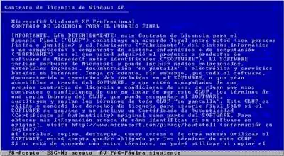 4-A continuación nos mostrará la licencia de Windows que debemos de aceptar pulsando F8 para seguir instalando Windows XP.