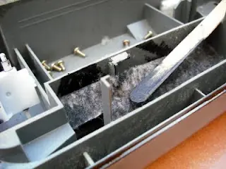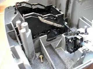 Los distintos compartimentos de la base están impregnados de tinta. En uno de ellos hay unas esponjas para absorberla, pero ahí no es donde más tinta había. La tizne del interior de la carcasa blanca no sé de donde habrá salido. Si será del olor desprendido por la tinta, o ya vendría así de fábrica.