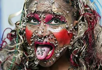 No es un arbolito de navidad, es Elaine Davidson, o lo que queda de ella. A pesar de que ya no es una niña, Elaine es la pesadilla de cualquier padre y de los detectores de metales: en total cuenta con 5.920 piercings alrededor del cuerpo, que son más de 3 kilos de metal.