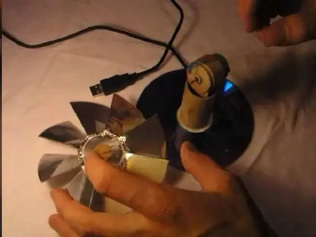 A continuación, pasaremos el cable USB por el hueco del segundo CD ó DVD y por dentro del tubo de cartón, y unir los terminales (+5 y -5) del cable USB al motor de corriente continua. Por último unir la hélice al motor, es recomendable usar un buen pegamento para unir todas las partes y dejarlo secar todo el tiempo que especifique tal adhesivo.
