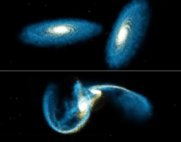 La vecina de la Vía Láctea, Andrómeda, se come actualmente a uno de sus satélites. Más de una docena de racimos de estrellas se esparcen a lo largo de Andrómeda, son los restos cósmicos de pasados festines. La imagen superior es una simulación de Andrómeda chocando con nuestra galaxia, un acontecimiento que ocurrirá en aproximadamente 3 mil millones de años.