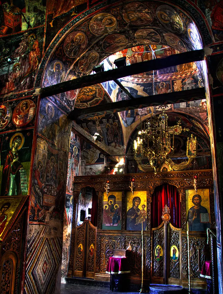 Cómo la gran mayoría de Templos Ortodoxos, los interiores de estos Monasterios ofrecen una intensa decoración cargada de colores, labados en oros y bellas tallas en maderas.