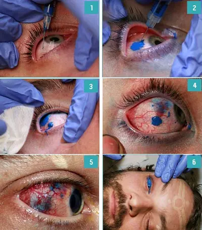 ¿Cómo se lleva a cabo? Bueno, si no entienden la imagen que acompaña esta entrada, les diré que el tatuador inyecta tinta bajo la conjuntiva del paciente hasta que todo el ojo (la parte blanca) ha quedado llena del pigmento. Se requieren, a veces, hasta 40 aplicaciones hasta que el ojo queda completamente azul. Por cuestiones de seguridad, la tinta es mezclada con un antibiótico para no provocar una infección en el ojo.