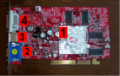 La imagen creada por el procesador se manda al monitor, ya sea por la salida VGA (salida estándar) o bien por la DVI (especial para monitores TFT). (2) y (4).