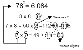2º El primer dígito se multiplicará por el inmediatamente superior, es decir, si es el 3 se multiplicará por el 4, si es el 7 por el 8, si es el 9 por el 10, etc. y el resultado serán las dos primeras cifras.