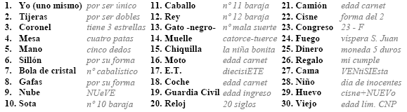 Una vez asignadas las letras a los números sólo es buscar las palabras adecuadas formándolas con estas letras, así podría quedar que el número 10 fuese LoCo, la L por el 1 y la C por el 0, las vocales son lo de menos, el 33 MoMia, el 74 ToRo, etc.