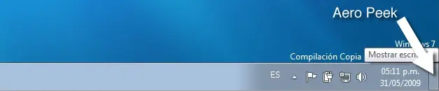 La nueva función de mostrar escritorio se llama Aero Peek y ahora se encuentra en la barra de tareas al lado del reloj del sistema, que con solo presionarlo puedes ocultar las ventanas para mostrar el escritorio y al volver a presionarlo las ventanas regresan a su lugar.
