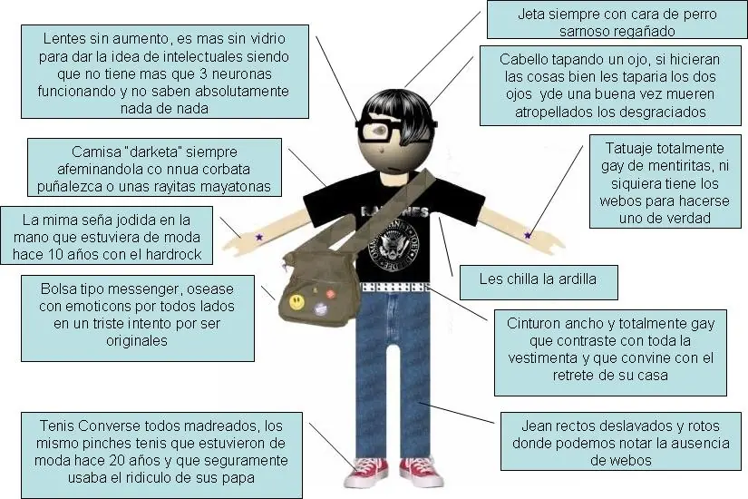 Pues parece ser que hay bastantes tribus dentro de los Emo, pues están los EmoPunks, los Screamo y demás variaciones, y claro, busqué una descripción clara de como son pero lo que mas hay son críticas como esta Anatomía de un Emo...