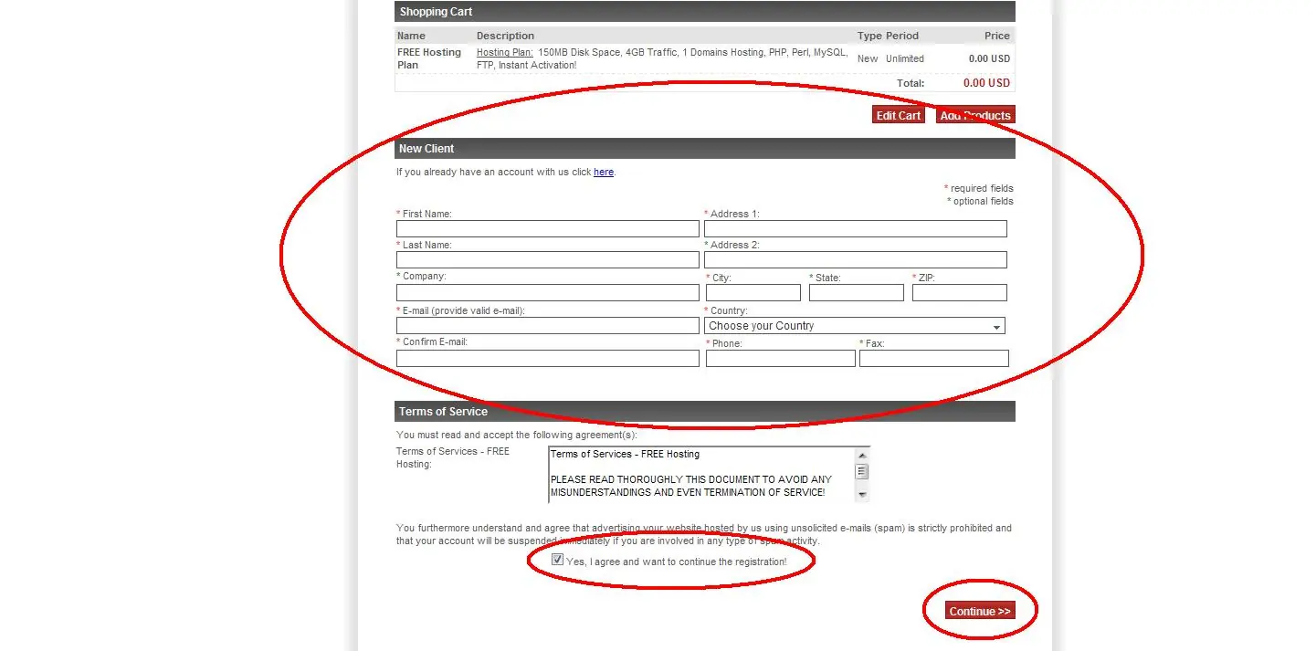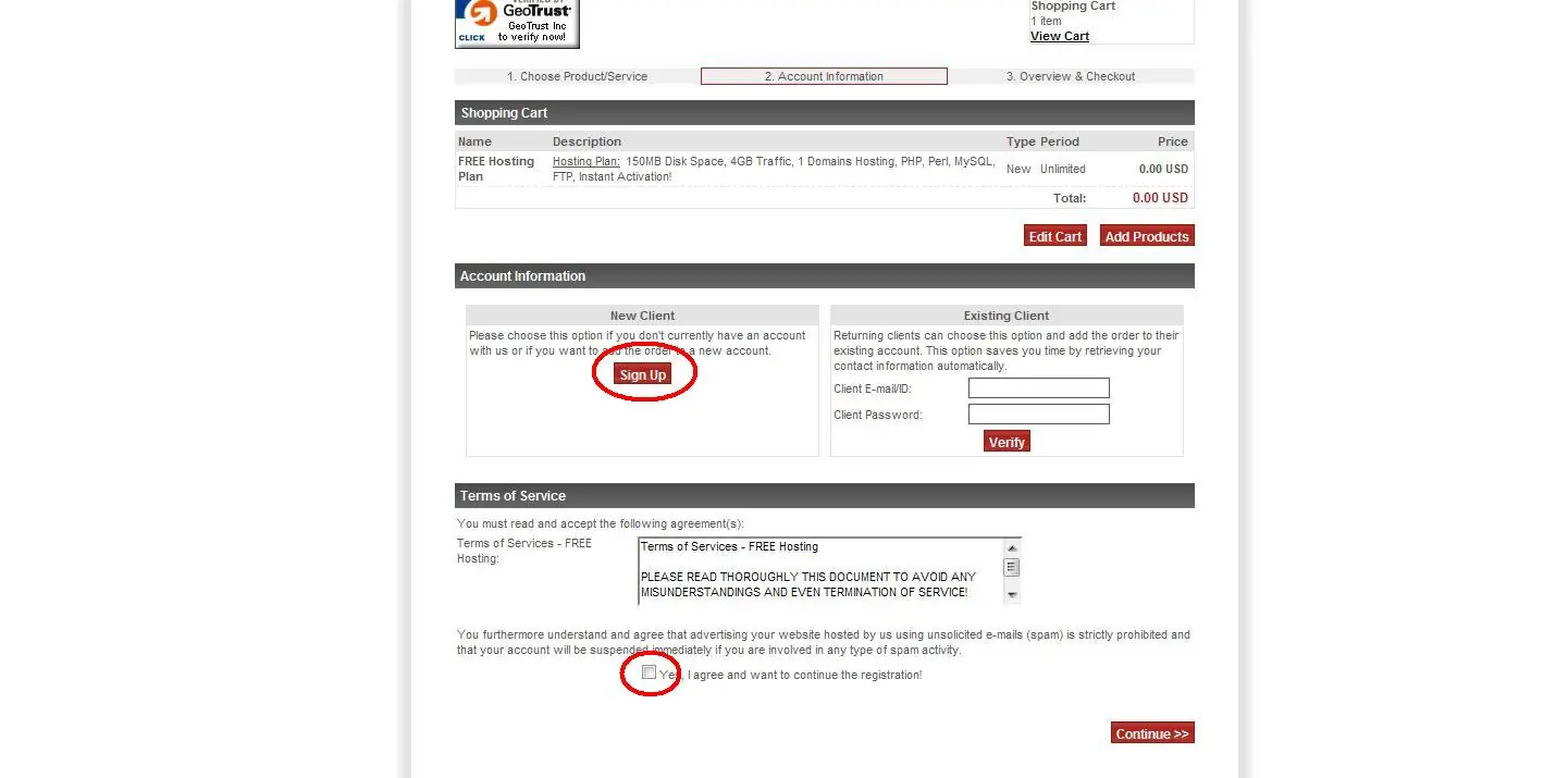 Cuando clickeamos en "Continue" nos lleva a una pagina donde debes registrarte como Usuario y tildar el box que dice "Yes, I agree and want to continue the registration!", para rellenar el formulario debes clickear donde dice "Sign Up", como les marco con el circulito rojo: