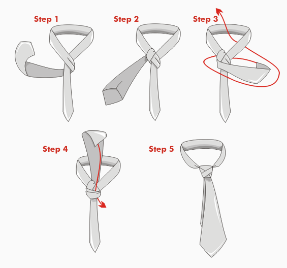 Cuidado, no olvide dar la vuelta 180º a una parte de la corbata (ver el esquema de aquí abajo).
