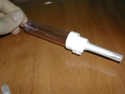 En la foto de abajo se puede ver el detalle de la parte que se introduce en la botella. Atención al taponcito de plástico que lleva en medio, es la entrada de aire, y debe estar abierto para que funcione bien.