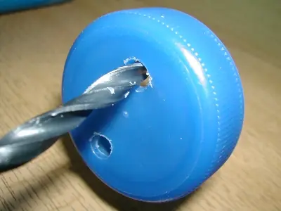 Taladraremos el tapón para alojar los goteros, haermos los agujeros que queramos (o quepan), en función del número de "goteros" a instalar, en este caso es para un bidon de 6 litros y he instalado dos goteros.