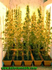 3.- Ahora la planta deja de crecer totalmente y se dedica exclusivamente a la producción de flores que van engordando los cogollos. Las hojas grandes se vuelven amarillas y se marchitan hasta que caen, la mayoría de las flores ya son fértiles y algunos pelillos se vuelven maroones y se marchitan. La producción de resina ahora es muy grande y la planta empieza a oler mucho, si se rompe un tricoma el olor se incrementa muchísimo y llega a ser molesto por ser muy fuerte. En condiciones naturales la planta ahora sería polinizada y dejaría de fabricar resina para centrar sus fuerzas en la produccion de semillas, pero el cultivo de cannabis narcotico para uso recreativo cultiva plantas "sinsemilla", esto quiere decir que al apartar los machos impedimos que la fabricación de tricomas y resinas pare hasta que la planta muera y asi obtenemos una cosecha muy superior en cuanto a resinas y pelotazo al fumar que cualquier otra planta que haya sido polinizada.
