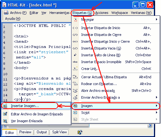 Ahora abre el index de tu Html-Kit y pon la vista "Editor". Como siempre, puedes cerrar la ventana de Workspace de la derecha para tener más sitio y maximizar la ventana del index. Mejor, verdad? je je.