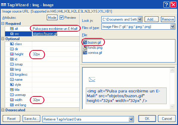 Fíjate como tras seleccionar el archivo buzón en la ventana derecha de arriba, podemos escribir el "alt" del que hablamos páginas atras, y como por fín he descubierto como poner las unidades en el ancho y alto de la imagen.... era obvio verdad? je je je. Pues si, escribe "px" detrás de cada cifra de auchura y altura después de poner al "alt" y luego pulsa el Ok.