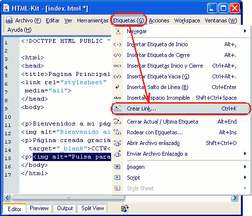 Una vez seleccionado pulsa en la barra de herramientas del Html-Kit sobre Etiquetas > Crear Link...: