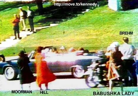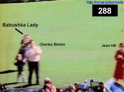 Este es el fotograma 288 del film de Zapruder en el que puede verse como la mujer conocida por Babushka Lady se encuentra detrás de Charles Brehm y su hijo. A la derecha del fotograma comenzamos a ver a Jean Hill (mujer del vestido rojo). Este fotograma esta tomado menos de dos segundos antes del disparo fatal a la cabeza. Si observamos detenidamente los movimientos de la mujer en el film nos damos cuenta de que Babushka Lady está filmando la caravana presidencial con una cámara de cine, probablemente una 8 mm como la de Abraham Zapruder, pero desde el lado contrario