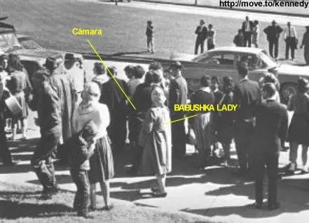 En el film de Muchmore podemos ver a Babushka Lady desde el ángulo opuesto y apreciar lo que se encontraba filmando en el momento del disparo fatal a la cabeza. Desde luego su ángulo de filmación era privilegiado para captar el montículo de hierba en ese preciso momento. En la siguiente imagen apreciamos a Babushka Lady tras el tiroteo y podemos ver cómo lleva la cámara en la mano: