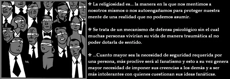 La religiosidad es una racionalización, es decir, es la manera en la que nos mentimos a nosotros mismos o nos autoengañamos para proteger nuestra mente de una realidad que no podemos asumir. Como el hecho de que nuestra mente es un subproducto de una parte del funcionamiento cerebral.