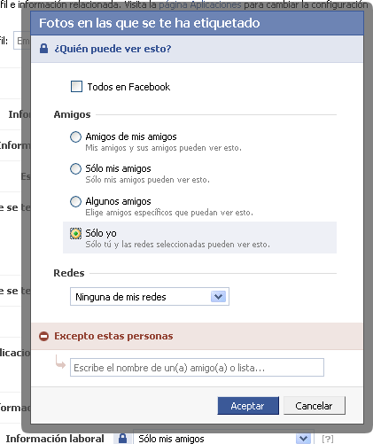4. Aparecerá un pop up que preguntará ¿Quién puede ver esto?, allí selecciona la opción “Solo yo” y presiona Aceptar, luego guardar los cambios en la parte inferior de la página.