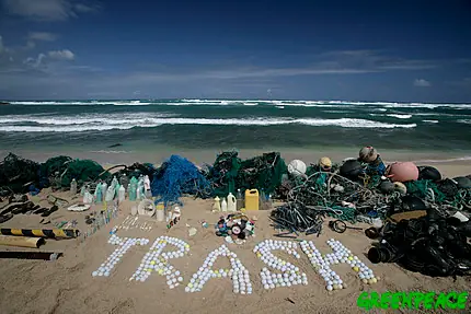 La palabra "trash" (basura en inglés) formada usando bolas de golf en la playa de Kahuku, Honolulu; Hawaii. La gran variedad de objetos mostrados en esta imagen nos muestra los diferentes orígenes de la gran variedad de plásticos en nuestros océanos.
