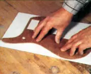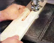 1. Después de rebajar una canal para colocar la varilla tensora de arce con un grueso de 1.90 cm (3/4" ) marque el trazado del mástil y empleando la sierra de banda corte por afuera de la línea.
