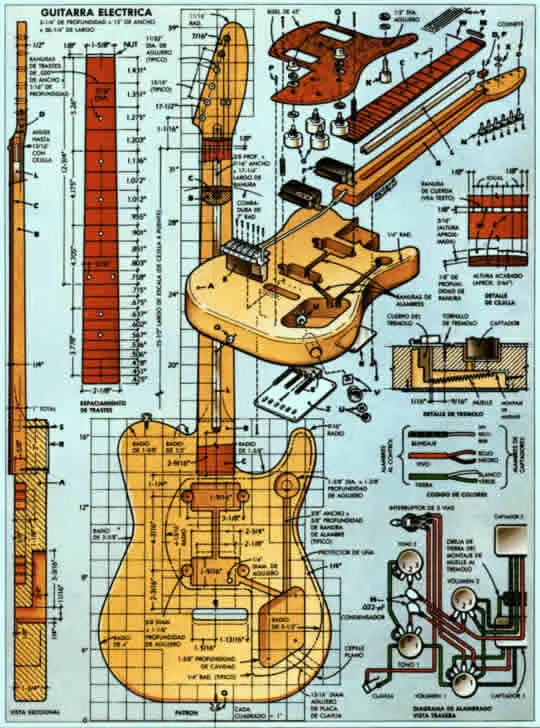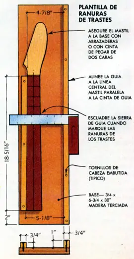 Aunque la guitarra es bastante fácil de construir, comience con unos dibujos a tamaño natural, de los cuales podrá transferir los detalles al trabajo. El mástil requiere un cuidado muy especial para que se cerciore de que está bien derecho y que los trastes queden instalados con mucha precisión.