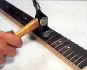 7. Instale los trastes doblándolos en una cuerva más cerrada que la de la tabla. Luego, martille los extremos en su lugar y golpéelos de un lado al otro ligeramente para asentar bien el traste.
