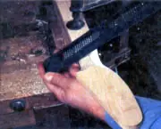 4. Dele forma al rebajo de la cabeza en una sierra de banda, hasta que haya llevado a 1.27 cm (1/2" ) el espesor de la cabeza. Suavice esta cara curva con una lijadora de tambor y a mano.