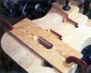 dijo:La fabricacion del mástil Nuestra guitarra tiene un mástil de arce con un diapasón de palo de rosa. El mástil está asegurado al cuerpo con cuatro tornillos y contiene una varilla tensora tipo caja que puede ser usada para enderezar el mástil, si se doblara bajo la tensión que producen las cuerdas. Seleccione arce de fibra recta para el mástil, lo bastante grueso para que pueda ser cepillado a una tabla plana de 1.9 cm (3/4" ) de grueso. Después de rectificar y rebajar el grueso del material, use una rebajadora con una guía para cortar el canal de la varilla tensora a través de la línea central. Asegúrese de que la varilla tensora se ajuste sin holgura y que el extremo superior de la varilla esté parejo con la superficie. Marque la forma del mástil y corte con una sierra de banda por la parte de afuera de la línea (Foto 1). Marque la posición de la cejilla en el mástil. Cepille el material del diapasón hasta aplanarlo, dejándolo de 0.64 cm (1/4" ) de grueso. Mantenga la cuchilla afilada y finamente asentada, y use un gancho de banco para mantener el material en su lugar (Foto 2). Marque la línea del centro, los lados extremos del cuerpo y la posición de la cejilla en el diapasón. Corte el exceso, en el extremo de la cejilla alrededor de 2,54 cm (1" ) más allá de la posición de la cejilla y corte con una sierra de banda por la parte de afuera del perímetro de las líneas que quedan. Aplique material epóxico de secado lento a los lados de la varilla tensora, fíjela en el canal y limpie con un paño el exceso. Aplique cola normal de carpintero a la superficie del mástil y fije en su lugar el diapasón y el mástil alineado (Foto 3). Deje que la cola seque hasta el otro día.