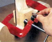 12. Después de perforar los agujeros de los tornillos a través del cuerpo, alinee y con una abrazadera ponga el mástil en su lugar, para transferir la posición del aguiero piloto al mástil.