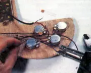 dijo:Protector de uña y alambrado Primero, usando madera terciada de 0.64 cm (1/4" ) haga una plantilla exacta de la pieza que protege al cuerpo de la guitarra de la uña con que se pulsan las cuerdas, e incluya todos los cortes para los captadores y controles. Esta plantilla no sólo actúa como una guía para darle forma al protector de la uña, sino que sirve como tabla de ensamblaje temporal para el alambrado. Utilice cinta adhesiva por las dos caras para asegurar la plantilla a la parte trasera del modelo protector (Foto 13) y córtela en la sierra de banda. Use una barrena con bisel con un piloto de cojinetes de bolas montado en la mesa de la rebajadora para desbastar el borde del protector (Foto 14). Use una barrena recta con piloto para cortar los agujeros del captador después de perforar con la barrena el primer agujero para comenzar. Perfore los agujeros para los tornillos de montaje del captador y controles, asegurándose de sostener firmemente el protector. ya que tiene la tendencia de levantarse cuando la barrena sale del material (Foto 15). Avellane todos los agujeros de tornillos del protector. Coloque los controles y captadores en sus posiciones en la plantilla del protector para alambrarlos. Utilice alambre común de conexión de calibre 22 para las conexiones. Primero alambre la pata viva del clavijero al terminal central del interruptor de tres vías. Utilice suficiente alambre para que el clavijero se pueda insertar en su agujero durante el ensamblaje. Conecte el lado de tierra del clavijero a la parte de abajo del potenciómetro más cercano. Ahora conecte cada lado del interruptor de tres vías a la lengüeta central del potenciómetro del volumen. De esta forma, el lado vivo del circuito puede ser dirigido a cada uno o ambos controles de volumen a través del interruptor de tres vías. Cada captador de doble bobina tiene cuatro alambres de colores y un alambre blindado sin revestir. Conectando los cables, como se muestra en el detalle de códigos de colores, se conectan en paralelo las dos bobinas a cada captador, para un sonido brillante. Para un sonido algo profundo con un pequeño aumento de potencia, puede alambrar las bobinas de cada captador en serie, conectando el alambre blanco y el rojo, y utilizando el negro y el verde para el vivo y la tierra. El alambre blindado siempre va a tierra. Como otros captadores pueden tener diferentes Códigos de colores, consulte las instrucciones del fabricante. Cuando suelde los alambres del captador a los potenciómetros de volumen, suelde los condensadores que conectan a los potenciómetros del volumen con los potenciómetros de tono (Foto 16). Termine por conectar todas las tierras y soldando un cable de tierra a la lengüeta del captador del puente que será conectado eventualmente al montaje del trémolo. Remueva los componentes alambrados e instálelos en el protector (Foto 17).