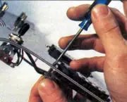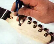 21. Después que ajuste las clavijas, atornille el retenedor de cuerdas en su lugar. Con éste se mantendrán las cuerdas colocadas hacia abajo a la vez que se ajustarán con fuerza a la cejilla.